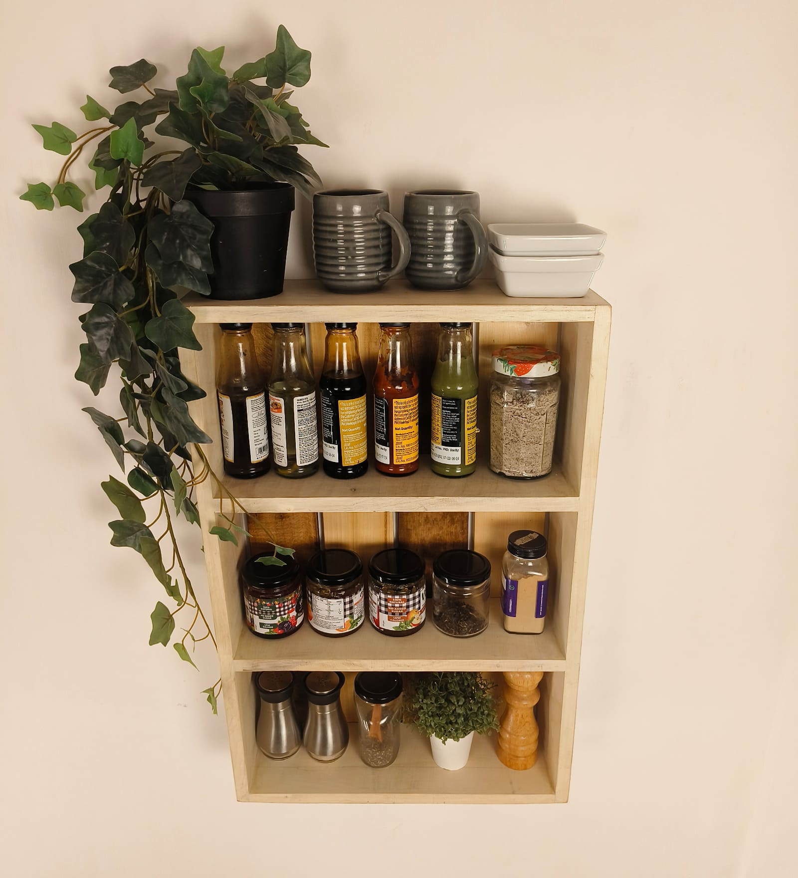 Designed for culinary lovers, this Kitchen Storage Rack features compartments perfect for spice jars and small bottles. The Solid Wood construction ensures durability while maximizing your wall space.