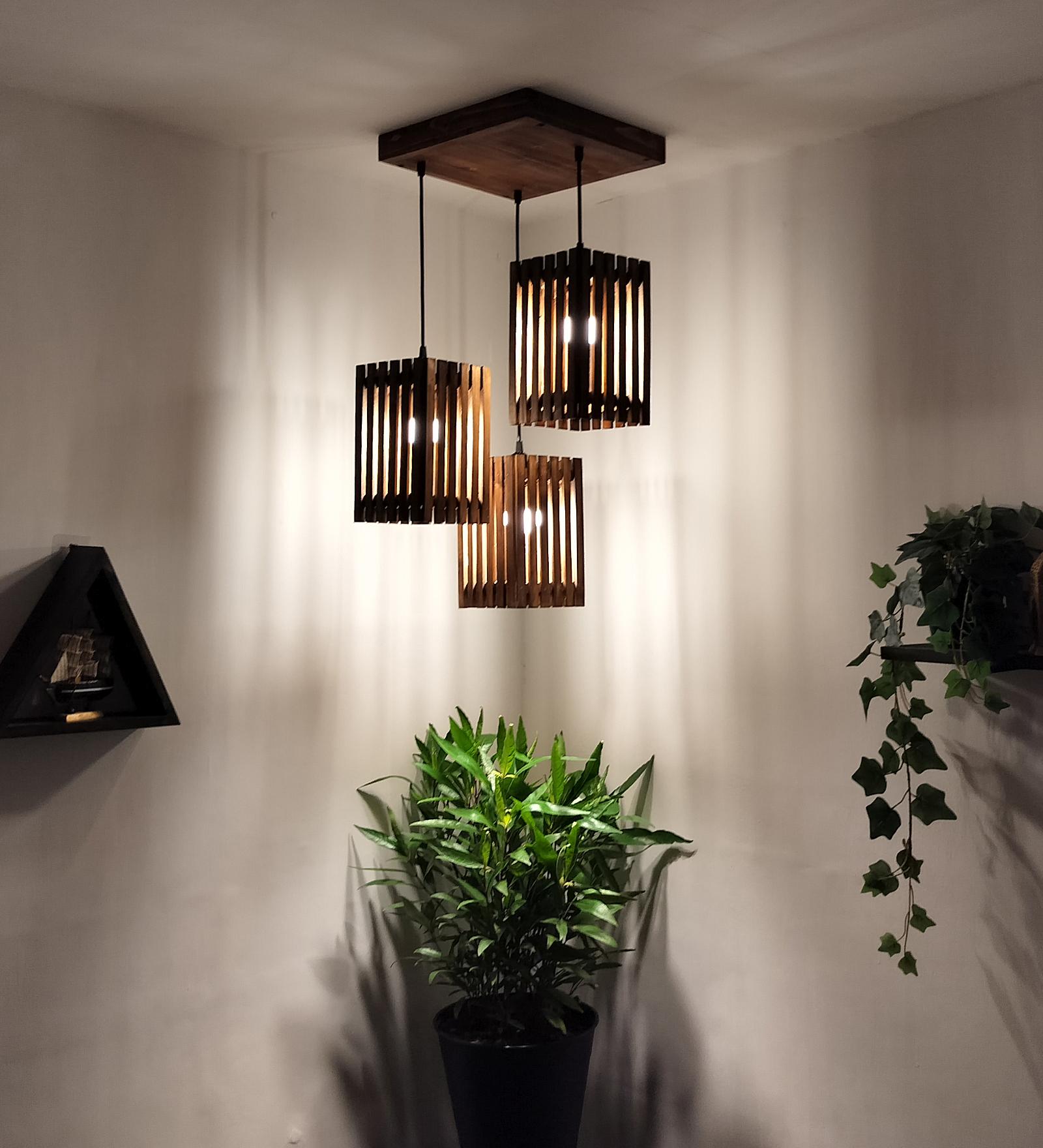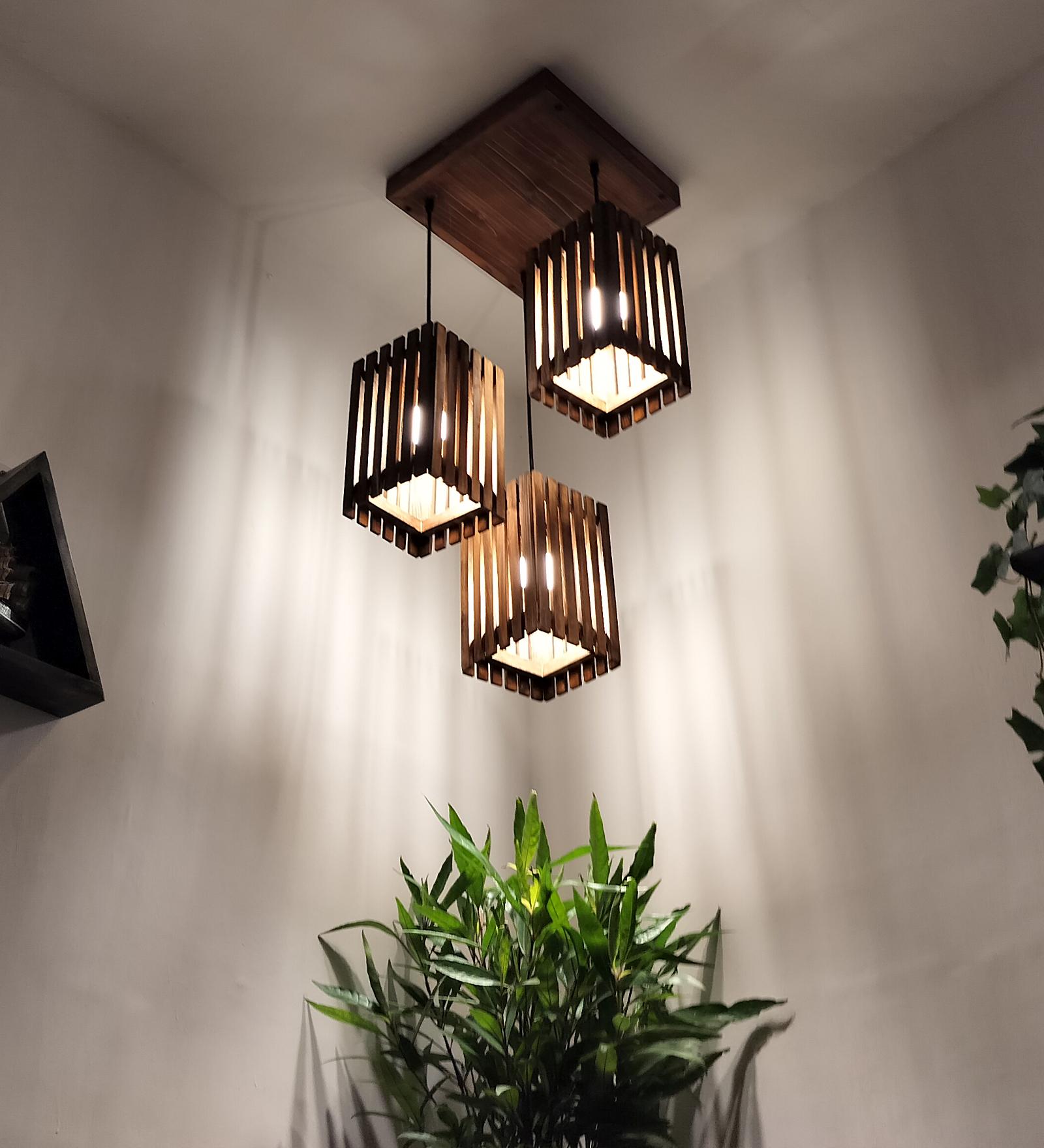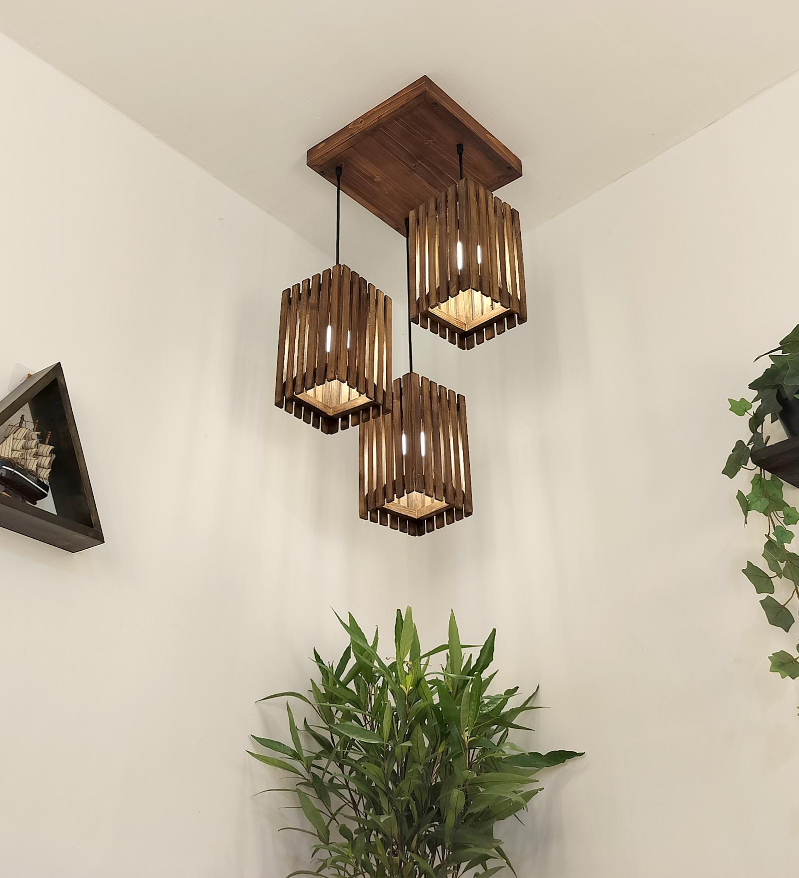 Elevate your interior with our Violet Brown Wooden Cluster Hanging Lamp. The natural Brown Pine Wood finish and suspended Rectangular design create a stunning focal point for dining areas or living rooms.